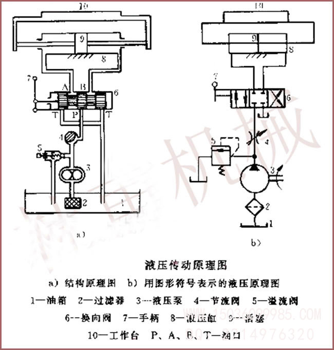 液壓傳動(dòng)的工作原理 如圖所示的磨床工作臺(tái)液壓傳動(dòng)原理圖,液壓泵3由電動(dòng)機(jī)帶動(dòng),從油箱1中吸油,然后將具有壓力能的油液輸送到管路,油液通過(guò)節(jié)流閥4和管路流 至換向閥6,換向閥6的閥芯有不同的工作位置(圖中有三個(gè)工作位置),因此通路情況不同,當(dāng)閥芯處于中間位置時(shí),閥口P.A、B.T互不相通.通向液壓缸的油路被堵死,液壓缸不通壓力油,所以工作臺(tái)停止不動(dòng);若將閥芯向右推(右端工作位置),這時(shí)閥口P和A,B和T相通,壓力油經(jīng)P口流人換向閥6,經(jīng)A口流入液壓缸8的左腔,活塞9在液壓缸左腔壓力油的推動(dòng)下帶動(dòng)工作臺(tái)10向右移動(dòng);液壓缸右腔的油液通過(guò)換向閥6的b口流入到換向閥6,又經(jīng)回油口T流回油箱1;若將換向閥6的閥芯向左推(左端工作位置),活塞帶動(dòng)工作臺(tái)向左移動(dòng);因此換向閥6的工作位置不同的,就能不斷改變壓力油的通路,使液 壓缸不斷換向,以實(shí)現(xiàn)工作臺(tái)所需要的往復(fù)運(yùn)動(dòng)。